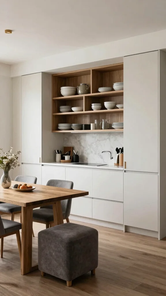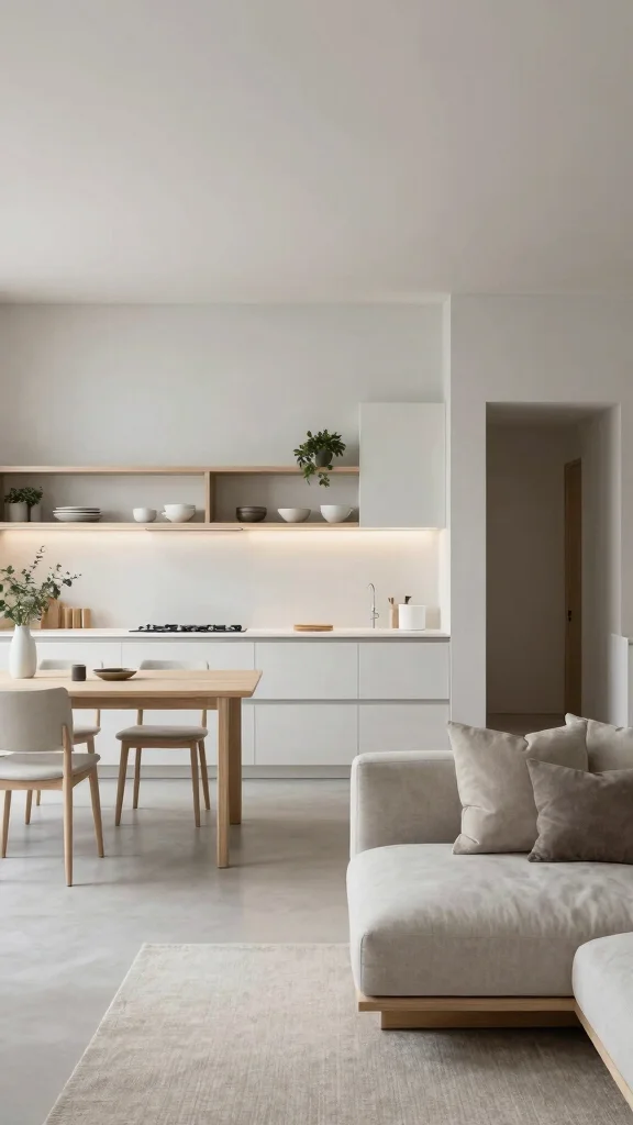 To fully embrace this style, think about incorporating open shelving to showcase beautiful dishware or greenery, which adds life without cluttering your countertops. Opt for a simple dining table paired with stackable chairs, providing flexibility and space when needed.