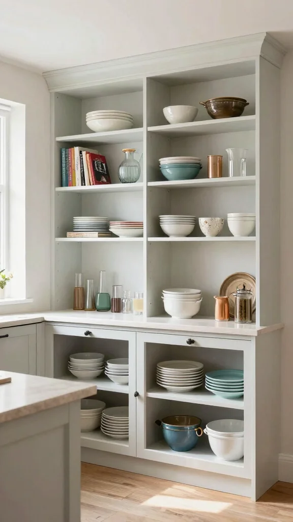 – Use eye-catching shelving to display attractive dishes or decorative pieces.