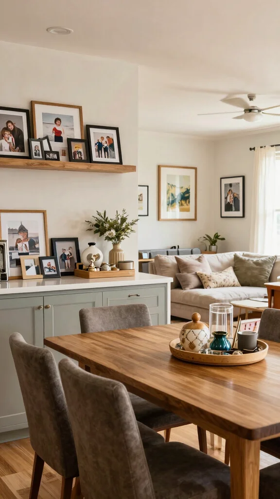 To make your kitchen dining living room combo uniquely yours, adding personal touches and details is essential. Include family photos, heirlooms, or travel souvenirs that narrate your story and infuse warmth. These personal elements can also serve as conversation starters when you have guests over. Additionally, custom-made or up-cycled furniture can add character and charm to your space.
