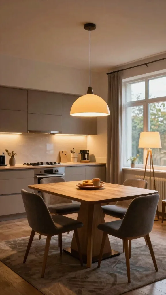 Add lighting to separate zones: pendant lights over the dining and soft ambient lighting in the living area.