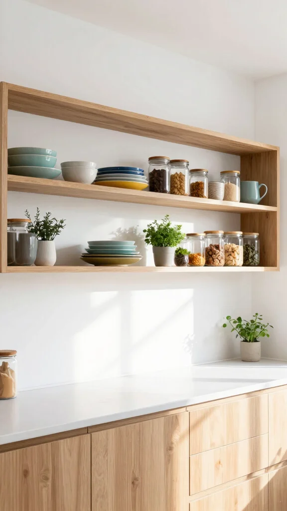 Open shelving beautifully balances function and style, contributing to a modern and relaxed kitchen vibe.