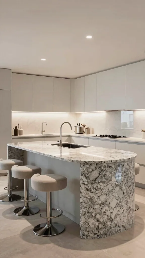 The curves create a natural flow, allowing for easy transitions between cooking and dining areas, making the kitchen feel more inviting.