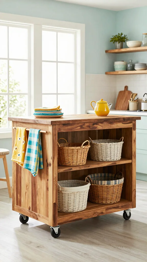 Using reclaimed materials not only supports sustainability but also adds character. This mobile island seamlessly transitions from a prep station to a buffet when entertaining guests.
