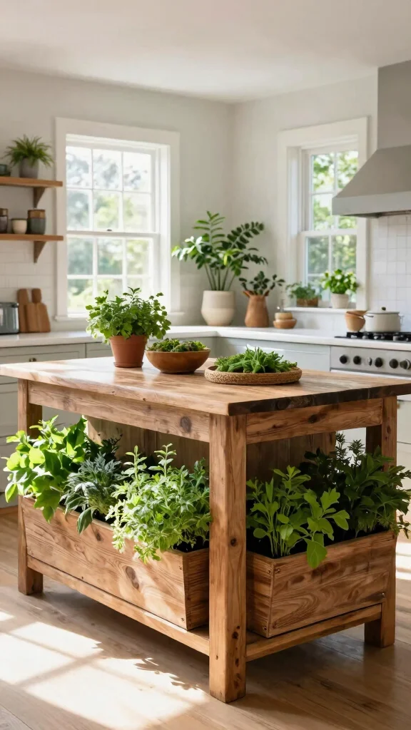 Bring the garden indoors with an island featuring built-in planters! This design not only adds visual interest but also provides fresh herbs right at your fingertips while cooking. A rectangular island with small planter boxes filled with herbs like basil or thyme creates a vibrant, lively kitchen atmosphere.