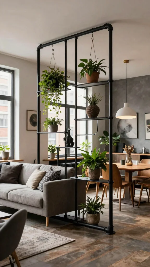Fun fact: Industrial pipe dividers can boost perceived space by up to 20% in small lofts. Pair them with vertical greenery to soften the metal and elevate your living and dining room partition ideas.