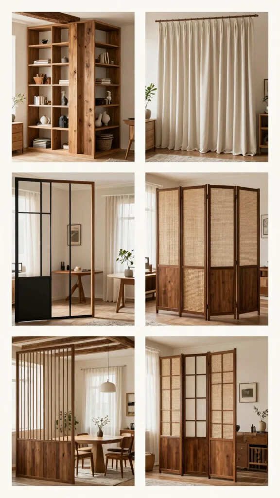 Match materials and colors to the room so it looks intentional. Use vertical elements like plants or bookshelves to create depth without heavy walls, and keep layout flexible with sliding or foldable panels.