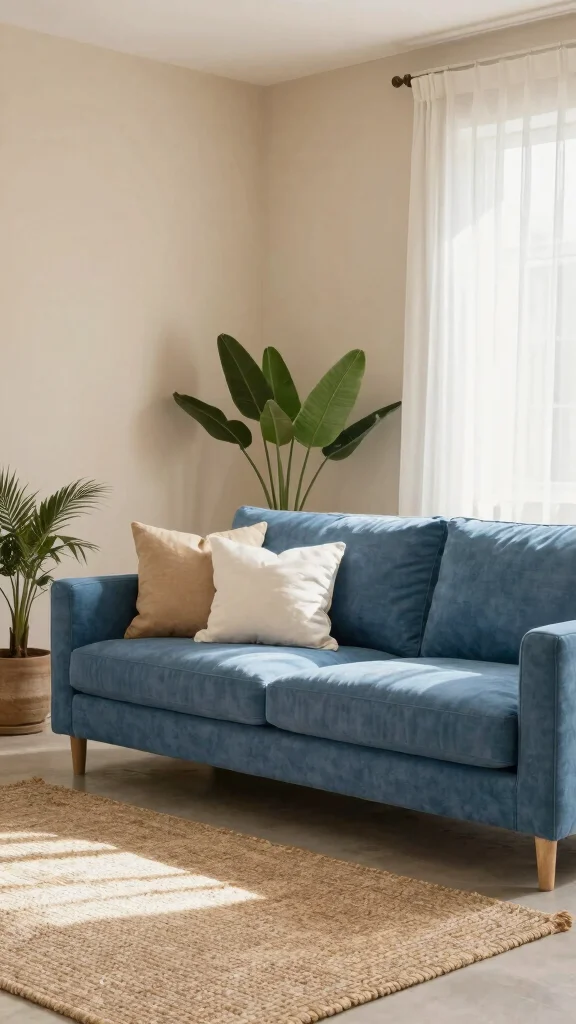 Ocean blue combined with sandy beige brings a calming beach-inspired vibe to your living room. This color palette transports you to the seaside, offering soothing tones that promote relaxation. Ocean blue accents can be effectively paired with sandy beige furniture, creating a cohesive and tranquil environment.To keep your space eco-friendly, consider using natural materials like jute for rugs and organic fibers for soft furnishings. This choice enhances the coastal aesthetic while supporting sustainable design practices.Tips for This Look:– Use ocean blue sparingly on accent walls to maintain a light feel.