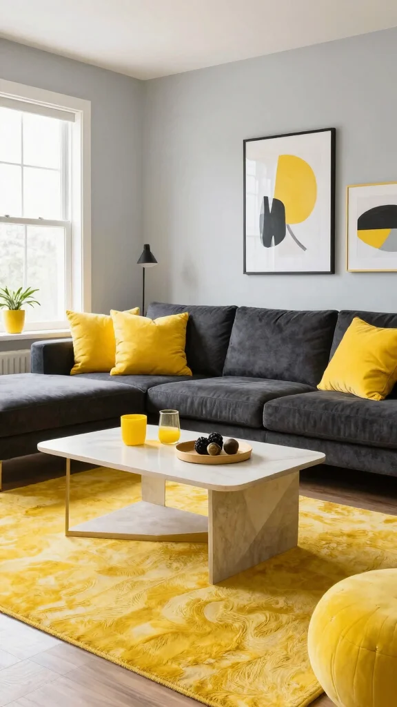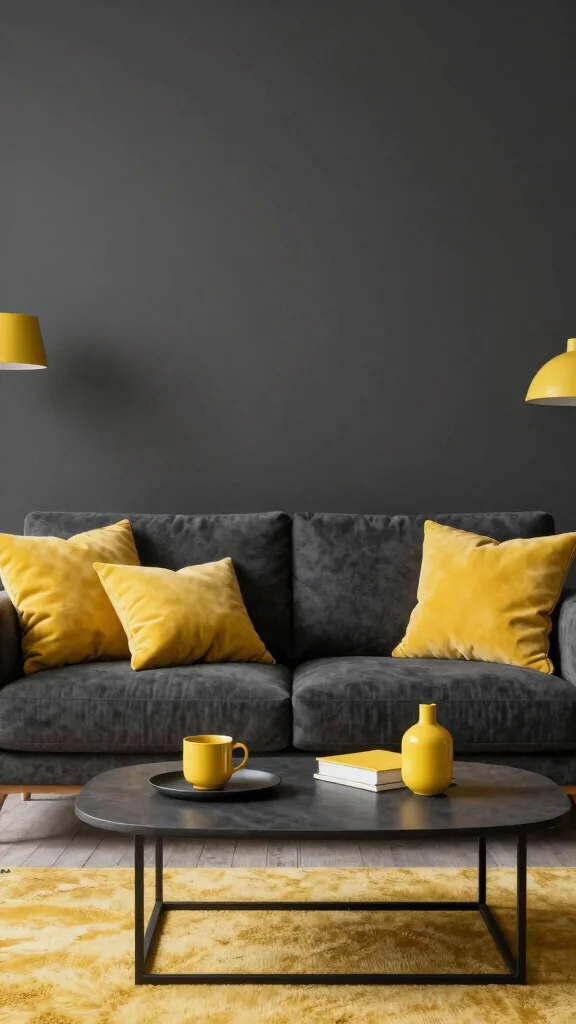 For those who appreciate bold contrasts, bright yellow paired with deep charcoal creates an energetic yet sophisticated ambiance. This dynamic combination makes your living room a standout space, perfect for showcasing personality and style. Bright yellow accents, such as cushions or artwork, beautifully enliven a room dominated by deep charcoal furniture, creating a warm and inviting atmosphere.When opting for eco-friendly choices, select sustainably sourced paints and fabrics. This ensures your vibrant style doesn’t come at the expense of the planet, allowing you to express yourself responsibly.Tips for This Look:– Use bright yellow sparingly to maintain balance; accents work best.
