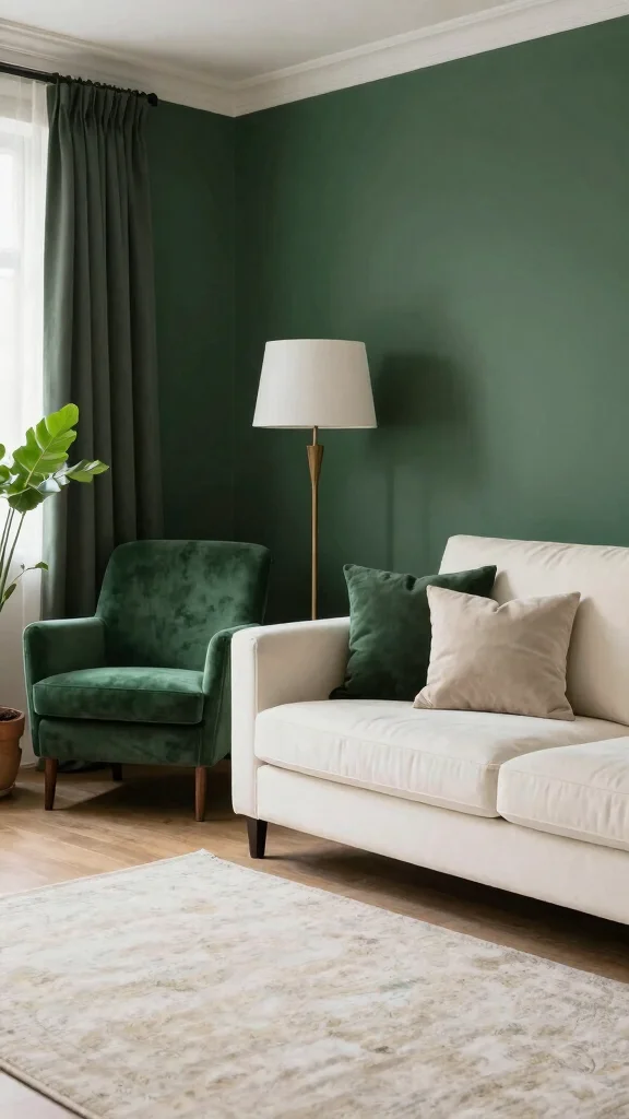 When deep green is paired with creamy white, you achieve a sophisticated and calming environment that feels fresh and elegant. This color scheme creates a beautiful contrast, allowing deep hues to anchor the space while creamy whites introduce lightness. It’s an ideal palette for those wanting to create a serene escape within their living room.To uphold an eco-friendly aesthetic, choose natural or recycled materials that are kind to the environment. Incorporating indoor plants enhances the green tones while promoting a healthy indoor atmosphere.Tips for This Look:– Use deep green as an accent color for decorative elements or an accent wall.