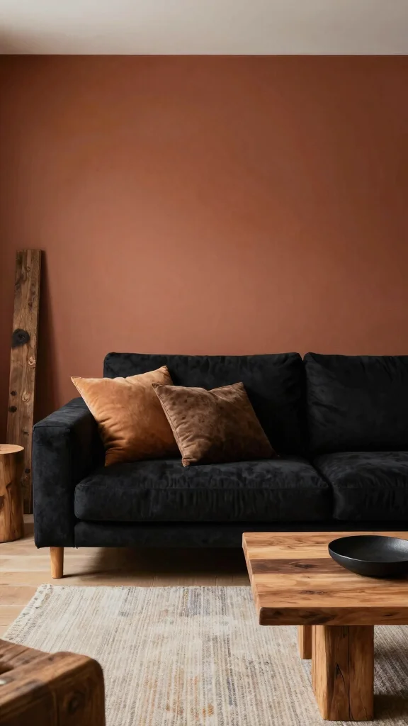 Combining bold black with earthy tones creates a dramatic yet grounded living room atmosphere. This palette is perfect for those wanting to make a statement while maintaining a cozy ambiance. Black accents, whether in furniture or decor, can be beautifully complemented by earthy tones like terracotta or muted greens, providing warmth and depth to the space.When choosing eco-friendly options, consider reclaimed wood furnishings or organic cotton textiles that keep your style chic and sustainable. This approach allows you to express your personality without compromising your commitment to the planet.Tips for This Look:– Use black sparingly to avoid a too-dark space; consider it for an accent wall.