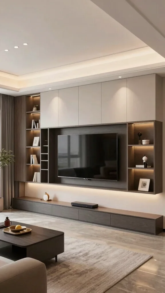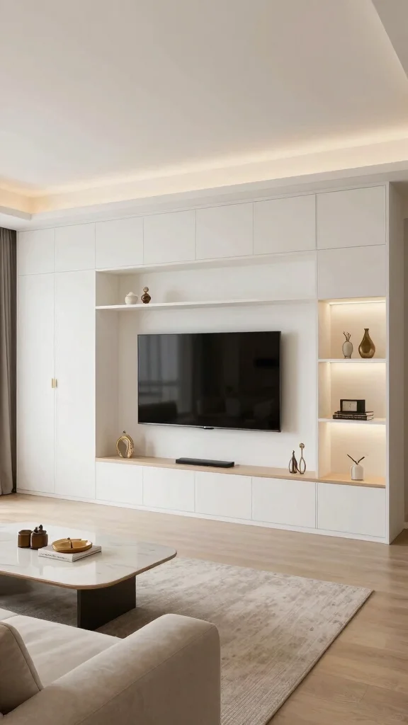 Embrace a truly modern aesthetic with minimalist wall-mounted units that blend storage and decor. These units can house your TV and media essentials while avoiding bulky furniture that can cramp your living space. Opt for streamlined designs featuring clean lines and neutral colors that merge into the background. Wall-mounted units can include shelves for decor and books or concealed spaces for a tidy appearance.