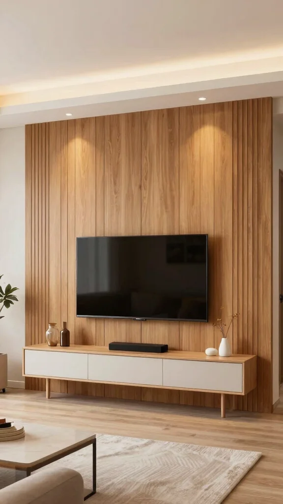Fun fact: vertical paneling can visually lift ceilings by several inches, making your living room tv wall feel taller and more open. Pair it with a floating TV mount for a sleek, airy look you can achieve in a weekend.