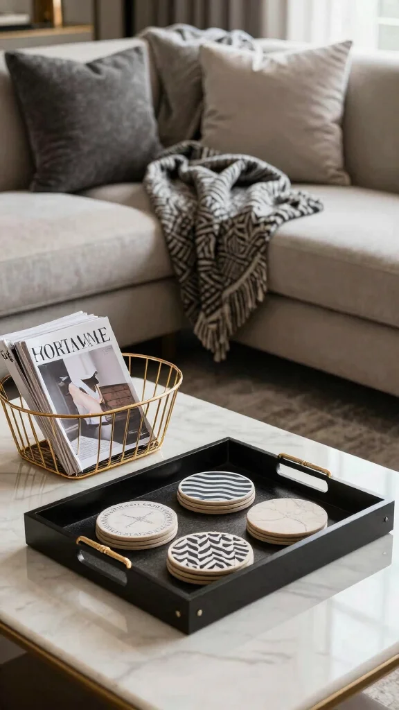 – Use artistic trays to organize coffee table items