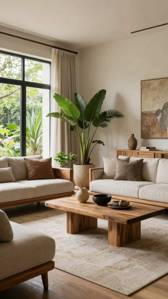 This integration of outdoor-inspired elements fosters a warm and inviting living room that reflects a luxurious yet eco-friendly lifestyle.