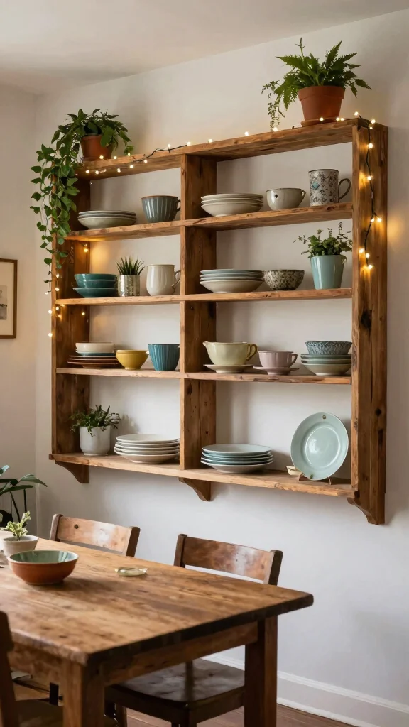 Open shelving adds a personal touch to your dining area while maintaining an airy vibe. This design choice showcases your unique style through curated displays of vintage dinnerware, potted plants, and cherished photographs. The combination of rustic wood shelves and cozy lighting, like warm fairy lights, creates a welcoming atmosphere that invites you to gather and connect. Consider placing these shelves above a dining table to enhance the sense of space and character in the room.