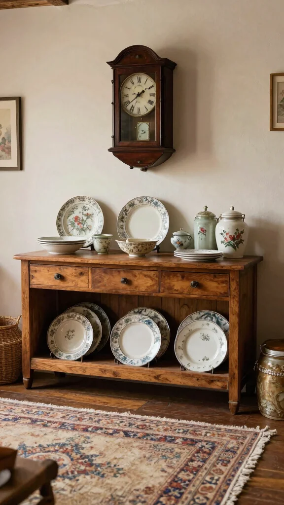 To enhance the vintage charm, mix textures and materials for an eclectic vibe that feels inviting. Consider using a large vintage clock above your buffet to create a visual anchor. Layering rugs can also bring warmth and richness to the overall ambiance, making the space feel cozy and lived-in.