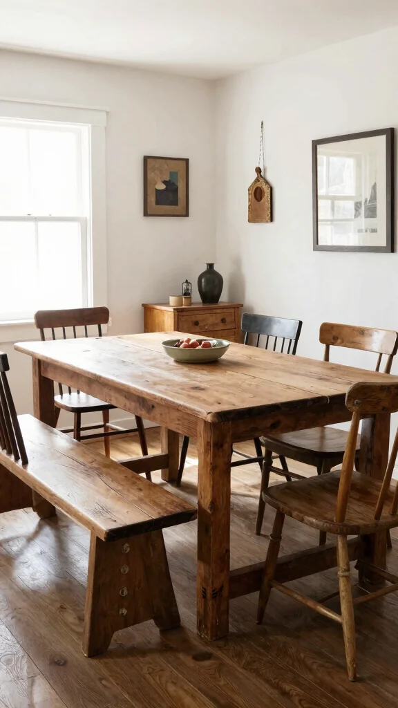 How can I combine rustic dining room decor with farmhouse style furniture?