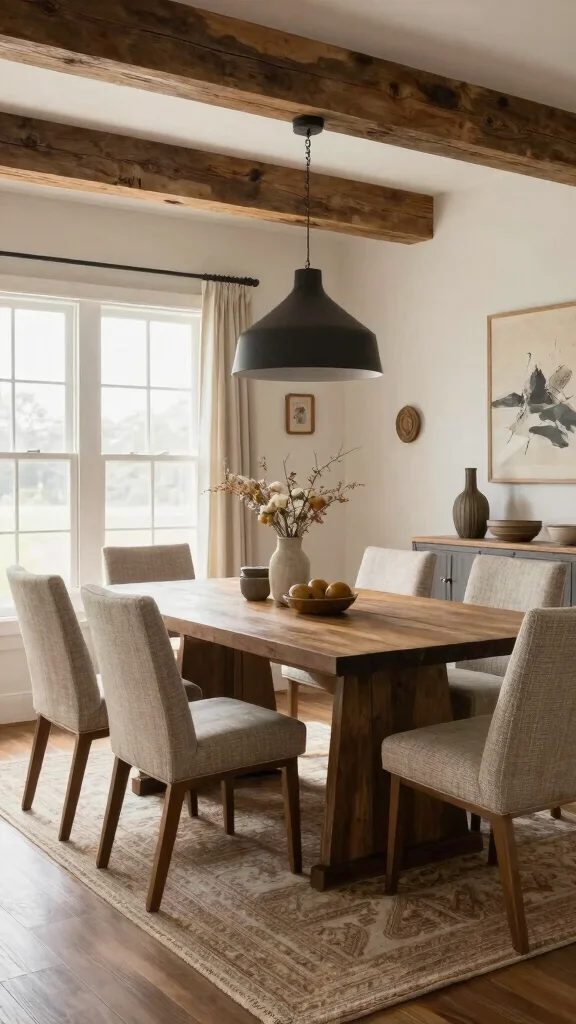 Mix in furniture with clean lines for a modern touch, keep hardware simple, and balance with textiles. Layer textures with linen, jute, and woven rugs, and choose rustic dining room decor pieces that complement farmhouse style furniture without overwhelming the space.