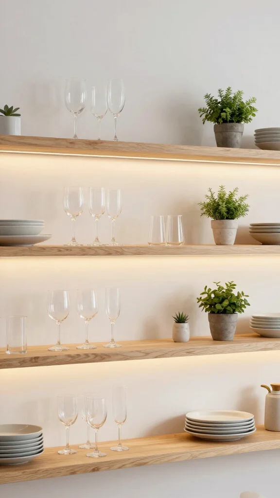 – Pair open shelves with a neutral backdrop for contrast.