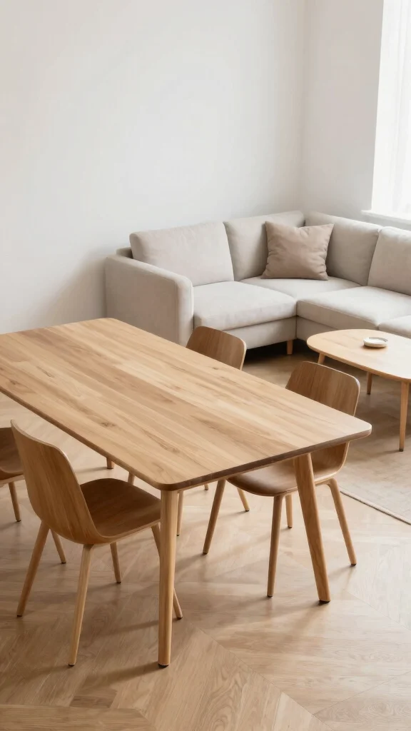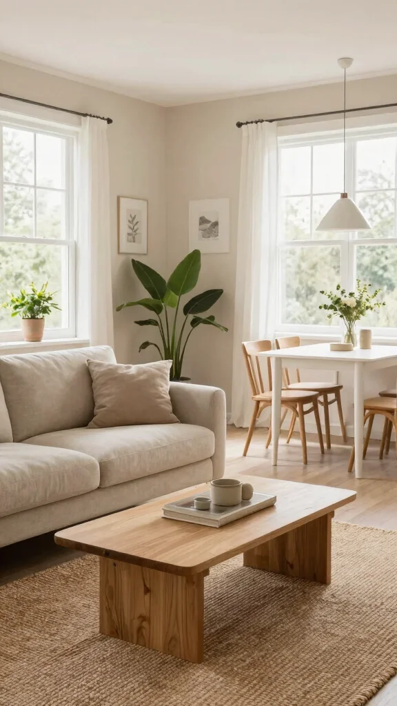 Practical setup: place the sofa to create subtle separation, position the dining table where it won’t obstruct paths, and incorporate space-saving furniture like nesting tables or a slim console to maximize usable space. The result is a calm, inviting space with natural flow.