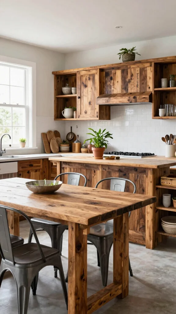 – Install a reclaimed wood dining table with modern chairs