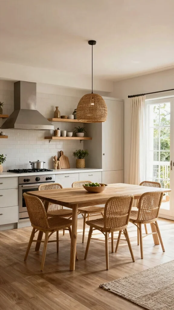 Start with a neutral base and repeat a cohesive color scheme across the kitchen, dining, and living zones. Tie spaces together with matching materials, like wood cabinetry, stone countertops, and textiles, and carry subtle accents through cushions, rugs, and artwork.