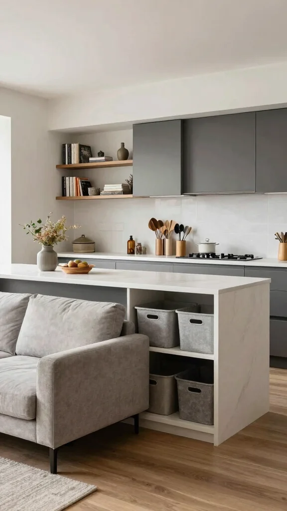 Consider under-sofa storage or built-in cabinets that blend seamlessly with your decor. Floating shelves can provide storage without taking up floor space, while multi-functional furniture doubles as stylish storage. Think about incorporating storage into your kitchen island to maximize every inch of your space while keeping it tidy and inviting.