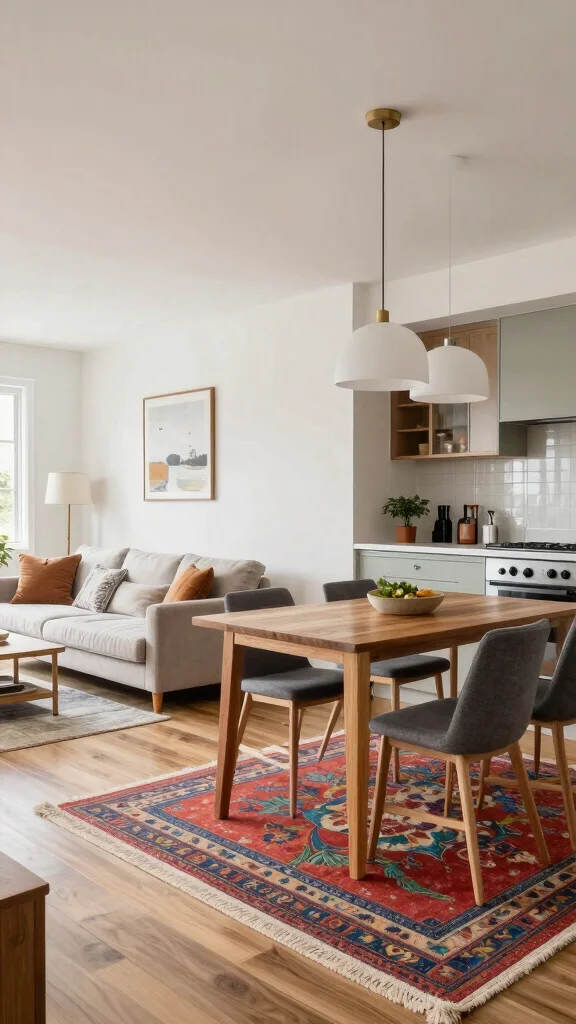 Define zones with area rugs and lighting that cue each space, while keeping sightlines open. Arrange seating to face multiple focal points—cooking, dining, and the view—so the room feels connected rather than separated. Use multifunctional furniture like ottomans with storage or a kitchen island that doubles as a dining area. Bookshelves, screens, or plant walls can create soft dividers without breaking the flow, and a cohesive color palette and open concept design ensure the space feels intentionally designed.