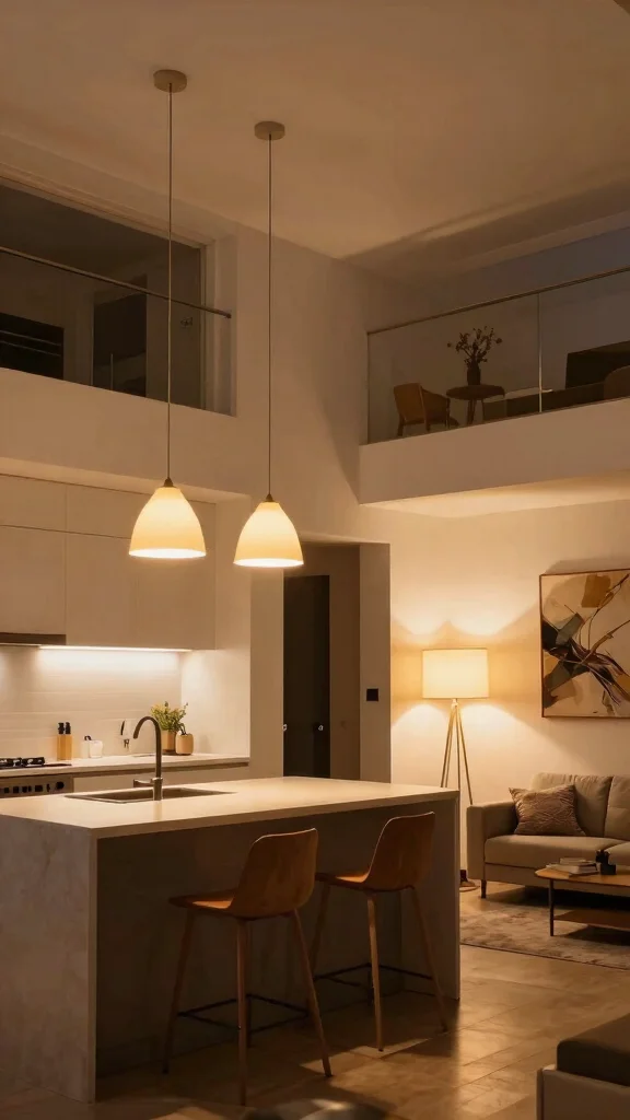 Consider pendant lights above the kitchen island for focused task lighting, paired with warm recessed lights throughout the living area for a cozy ambiance. Accent lights can spotlight artwork or architectural features, adding depth and intrigue. Installing dimmable switches gives you flexibility, allowing you to adjust the mood for any occasion.
