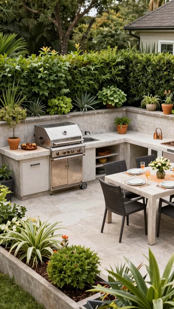 Incorporate low hedges or planters to naturally separate these zones while adding greenery to your outdoor kitchen.
