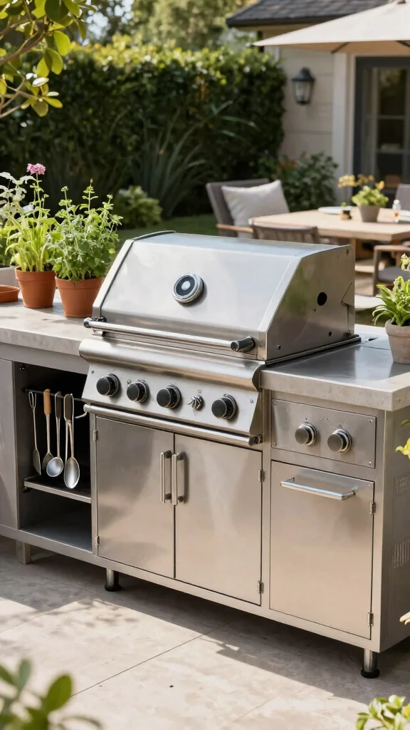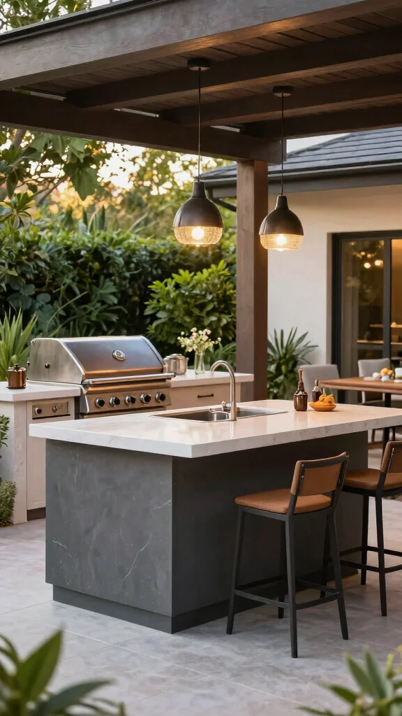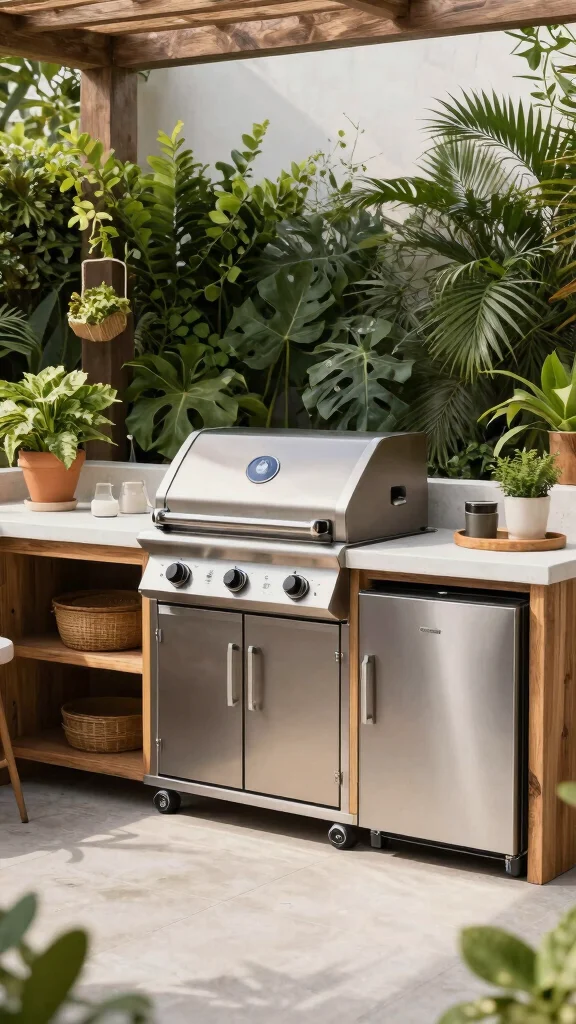 Choosing sustainable materials is essential for your outdoor kitchen design. Recycled glass countertops, eco-friendly concrete, and natural stone not only look beautiful but also harmonize with nature. The luminous surface of recycled glass reflects sunlight, while the versatility of concrete allows for unique shapes and designs, ensuring your kitchen is both functional and stylish.