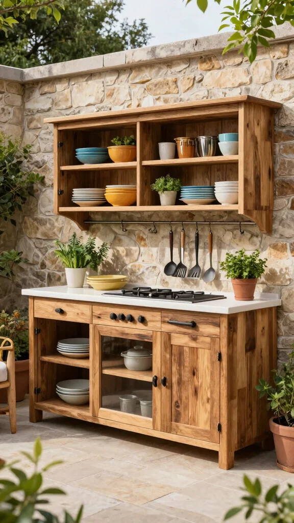 Effective storage is crucial in any outdoor kitchen design. Built-in cabinets and weather-resistant shelves keep your cooking space organized and tidy. Consider reclaimed wood for a rustic look that aligns with eco-friendly values, while open shelves can showcase your dishware.
