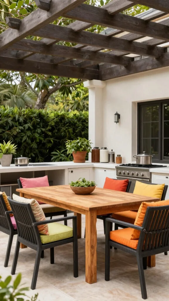 Select weather-resistant furniture that blends style with practicality for your outdoor kitchen. Materials like teak and aluminum withstand the elements while providing comfort. Add cushions made from fade-resistant fabric to maintain vibrant colors and ensure easy cleaning.