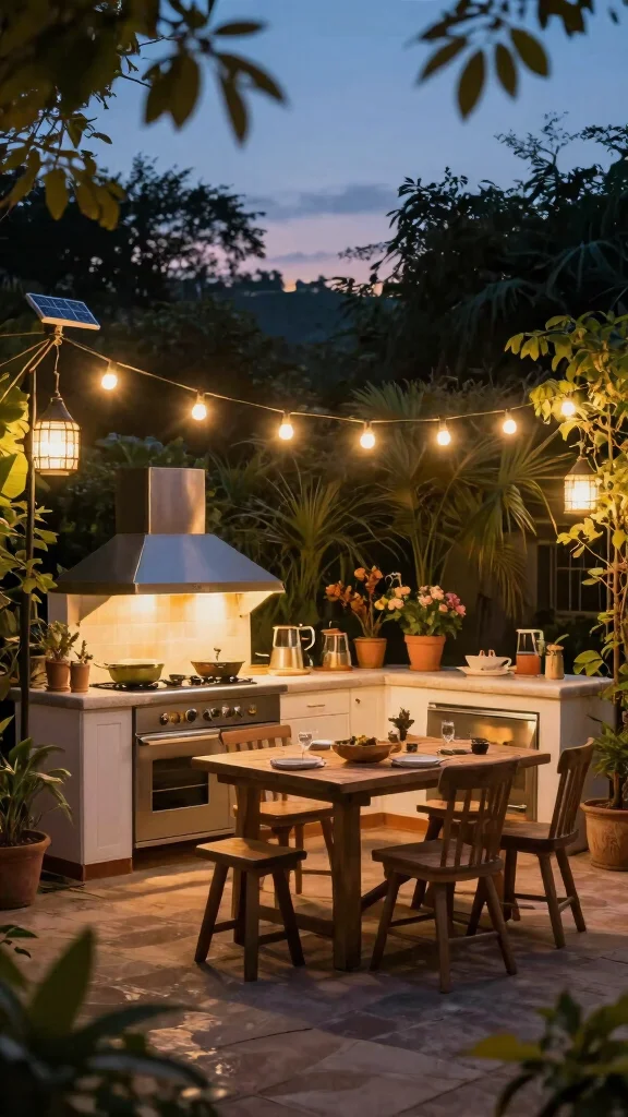 Brighten your outdoor kitchen with sustainable lighting that creates a welcoming ambiance while being energy-efficient. Use solar-powered fixtures, LED lights, and string lights to craft a magical atmosphere for evening gatherings. Dimmer switches can help set the perfect mood for any occasion.