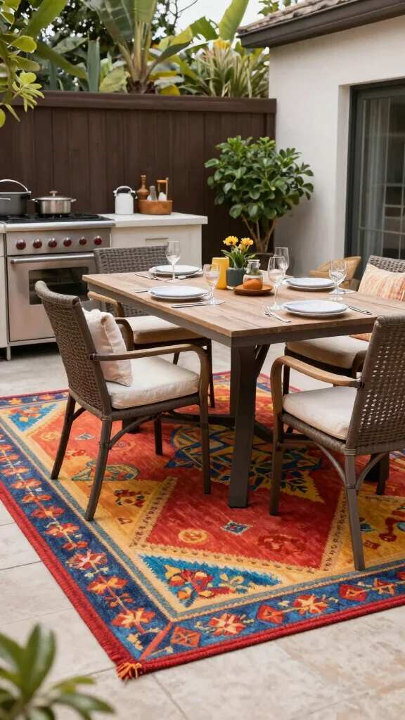 Rugs can also absorb sound, adding a cozy touch to your outdoor kitchen, making it feel like a true extension of your home.