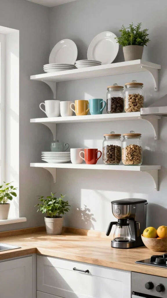 Open shelving brings a refreshing, airy vibe to your kitchen, offering both functionality and style. This design choice allows you to showcase your favorite dishes and glassware while promoting an organized space. A well-curated shelf can feature beautiful ceramics paired with vibrant cookbooks, creating a delightful visual impact.