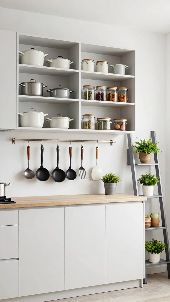 Consider implementing wall hooks for pots and pans, which not only saves space but also adds a decorative touch. Ladder shelves can fit discreetly into corners, displaying herbs or decor without sacrificing valuable floor space.