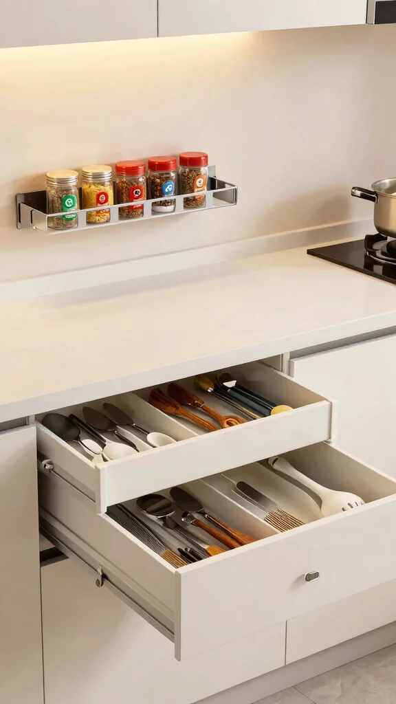 – Use drawer dividers to keep utensils sorted and accessible.