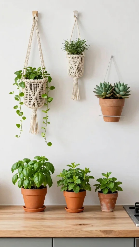 To effectively integrate greenery, start with small herb pots that are both practical and decorative. Hanging plants can utilize vertical space, while wall planters add a unique touch without cluttering counters.