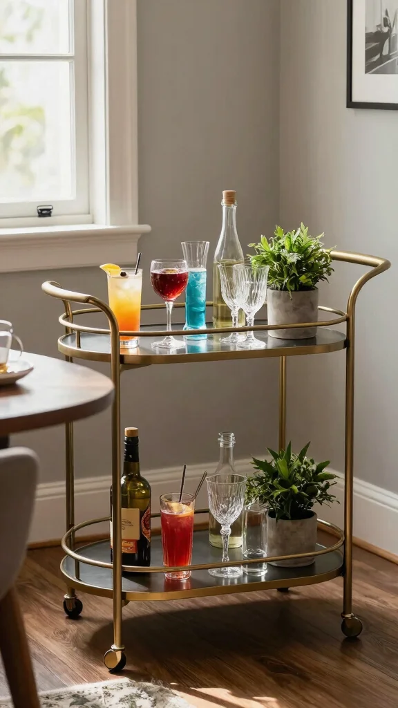Incorporating a bar cart adds flair and utility to your dining room while keeping everything easily accessible.