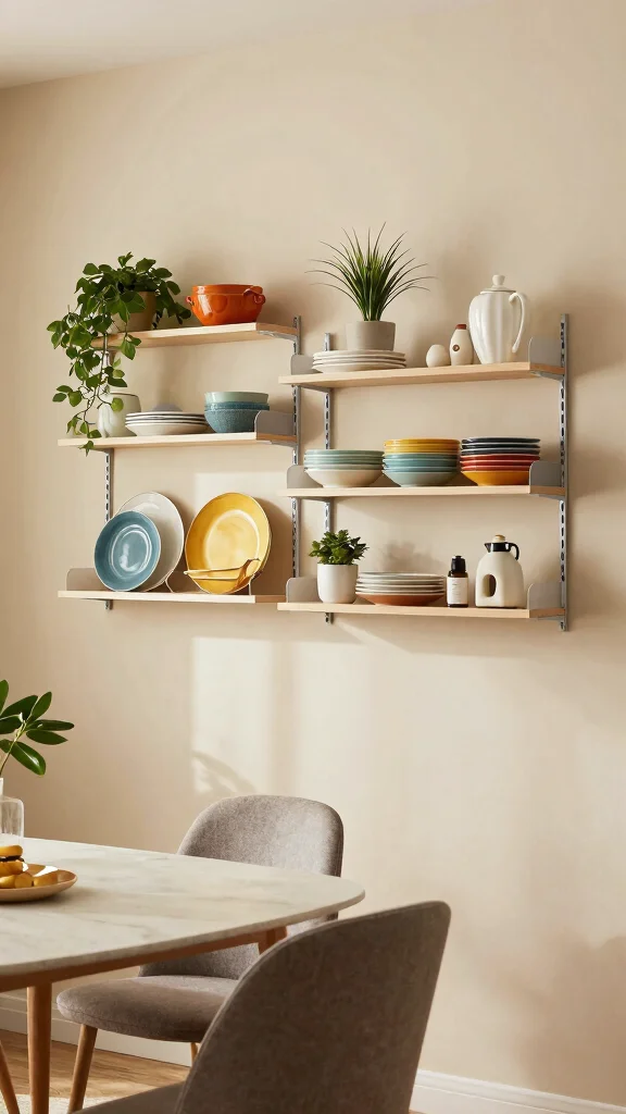Floating shelves combine elegance and functionality, making your small dining room feel open and stylish.