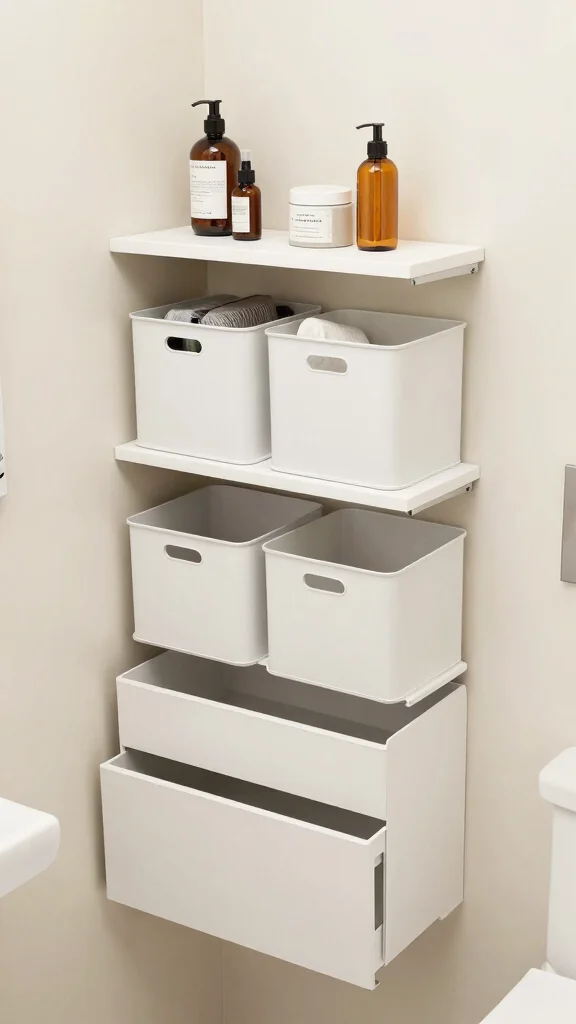 How can I add half bathroom storage solutions in a tiny space without clutter?