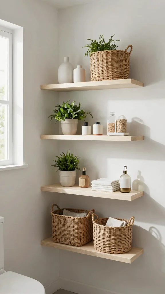 Stylish baskets can neatly hold toiletries, while decorative vases or artwork can personalize your space. Arrange shelves at varying heights to add visual interest and utilize vertical space effectively.