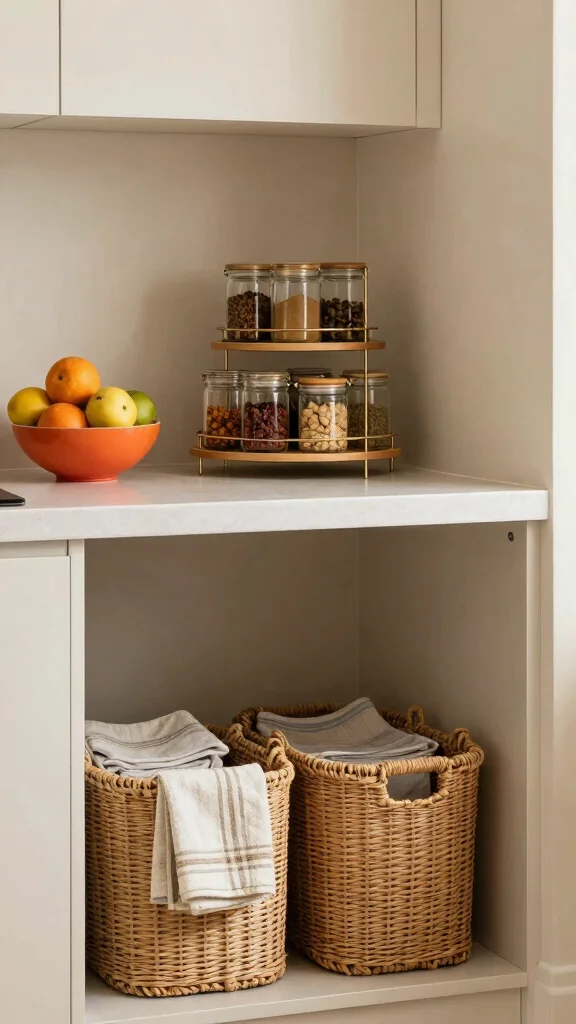 – Use decorative baskets for organizing and adding warmth.