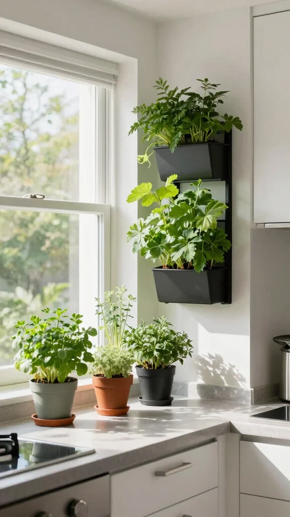– Use wall-mounted planters to save counter space.