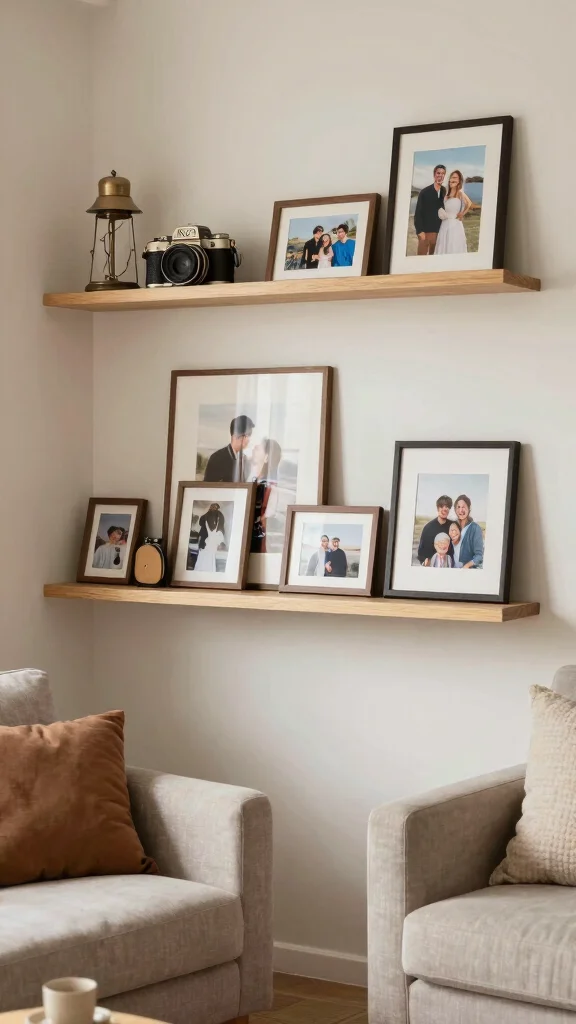 Position them above your couch or TV to utilize vertical space effectively. Tip: Mix different shelf sizes for an eclectic feel or opt for uniform designs for a more structured look. This creates visual interest while maintaining order. Consider decorative boxes or baskets on the shelves to keep smaller items organized yet easily accessible.