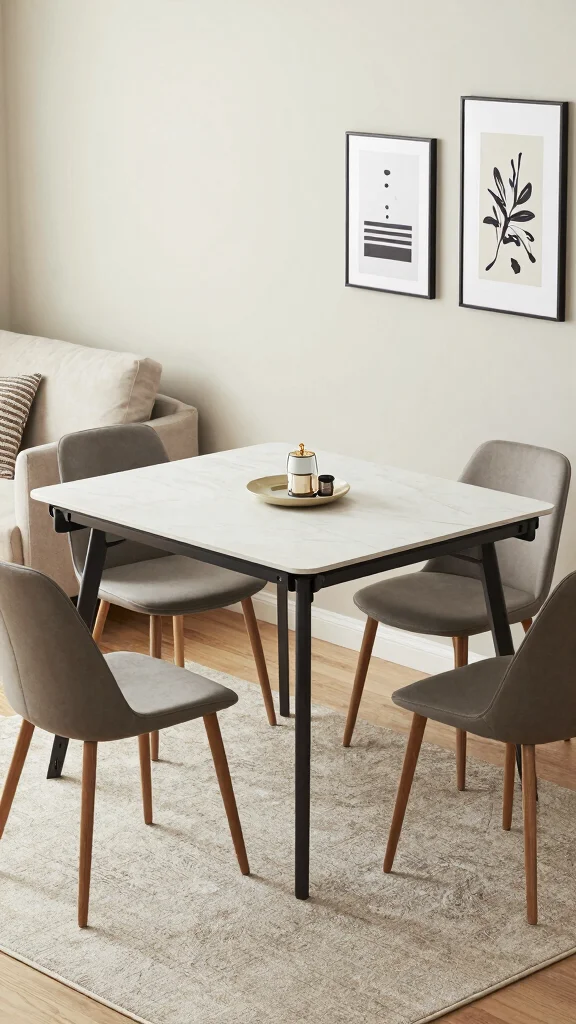 A foldable dining table is an excellent addition to a small living room with a dining area. This versatile piece can expand for family gatherings and easily collapse when extra space is needed for relaxation. Imagine a contemporary table that seamlessly adapts to your needs, perfectly suited for cozy dinners or fun game nights.