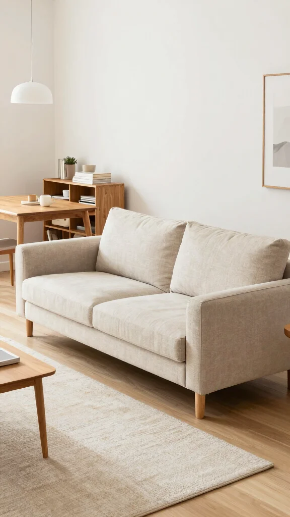 Maximize vertical storage with wall-mounted cabinets and floating shelves to free floor space. Opt for multifunctional furniture like an upholstered bench with hidden storage or a coffee table with drawers. Use under-seat storage in the sofa and select slim, tall storage units to reduce bulk while improving organization. Keep a minimal anchor rug and streamlined decor to avoid visual clutter, which helps the space feel larger and more open.