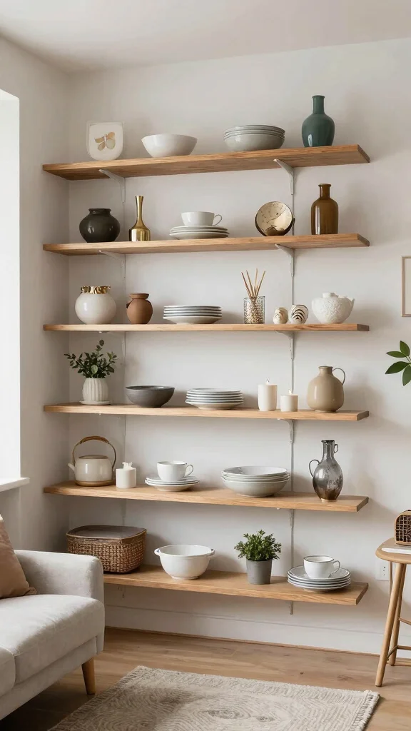 When styling open shelves, consider mixing functional items with decorative pieces for a balanced look.