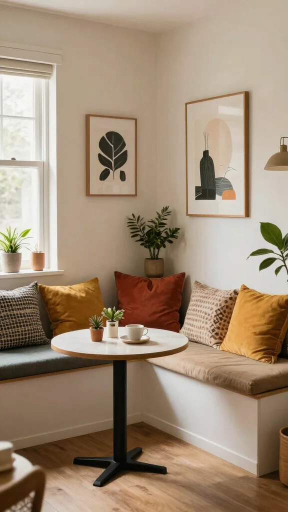 Built-in benches offer a wonderful way to blend a dining area into your small living room while conserving space. These cozy seating options can be placed along walls, creating a snug spot for meals or a quiet retreat with a good book. Add cushions for comfort, and a small table can complete this inviting nook.